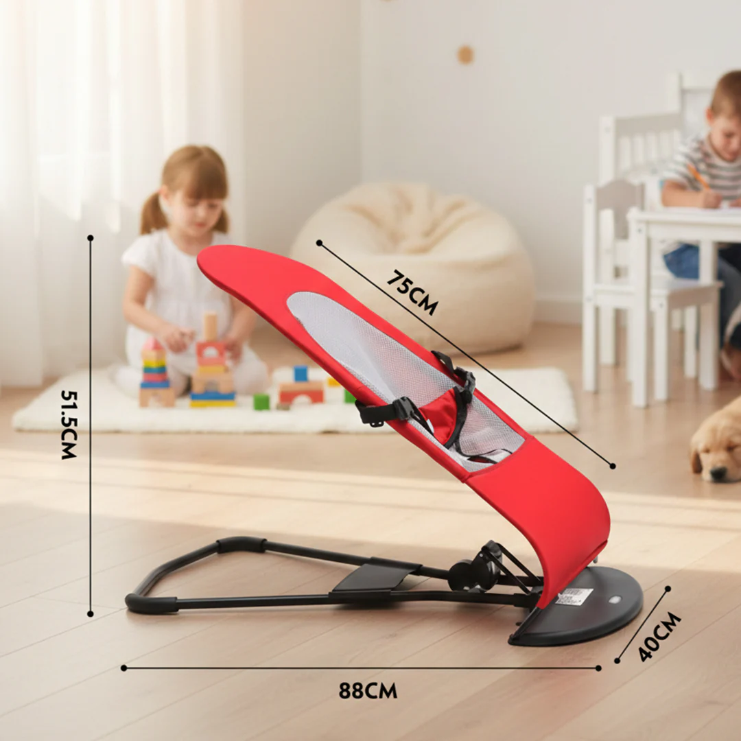 The vibrant red fabric and modern frame fit beautifully into any home decor, while the easy-to-clean materials make it a practical choice for busy parents. Whether they are wide awake and playing or starting to get drowsy, this bouncer provides the perfect, secure environment for your child’s daily routine.